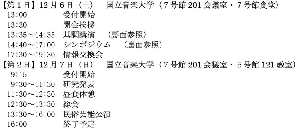 今大会は例年になく研究発表のお申し込みが多く、担当者は嬉しい悲鳴を上げております。そのため、発表会場を2か所とさせていただくことにしました。今大会では、「わらべうた」に興味のある方や保育・教育に携わっておられる方々などが広く参加してくださることを想定しております。シンポジウム「わらべうたのこれからを考える」では、榎田光代氏、野口啓吉氏、小出英樹氏のそれぞれのお立場から20分ずつご発表いただき、基調講演の尾原昭夫氏を交えてのディスカッションとともに、フロアからの質疑応答を予定しています。
